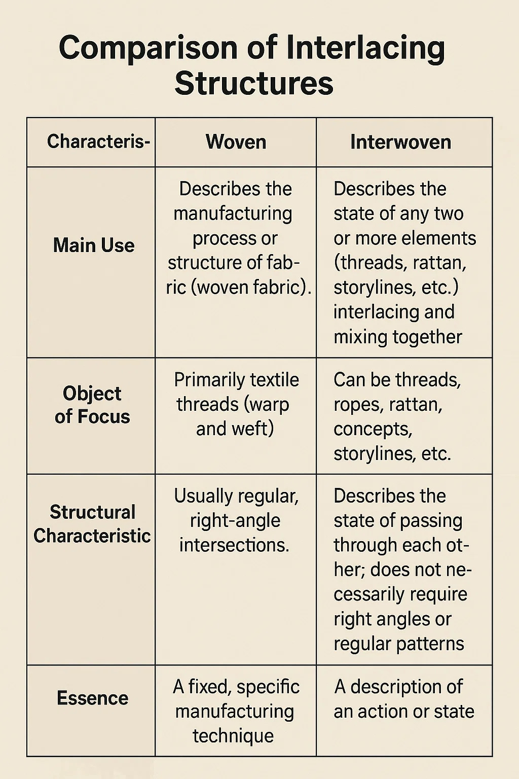 | Primär användning | Beskriver den specifika tillverkningsprocessen eller den färdiga strukturen av textilier (vävt tyg). | Beskriver tillståndet där två eller flera uppsättningar av element (trådar, vass, berättelser, etc.) korsas eller blandas. |