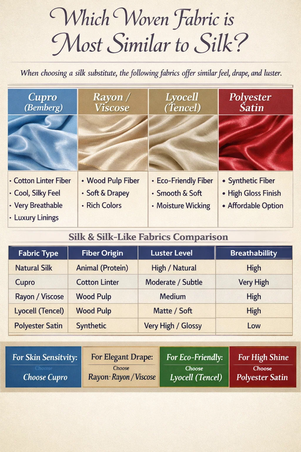 När du söker efter en vävt tyg som replikerar den lyxiga känslan, lystern och draperingen av naturligt siden, de mest framstående utmanarna är Rayon, Cupro och Lyocell (Tencel) . Bland dessa, Cupro anses allmänt vara den närmaste matchen när det gäller andningsförmåga och silken touch, medan Satinvävd polyester fungerar som det vanligaste prisvärda syntetiska alternativet. Dessa tyger använder specifika vävning tekniker för att efterlikna de släta proteinfibrerna som produceras av silkesmaskar.